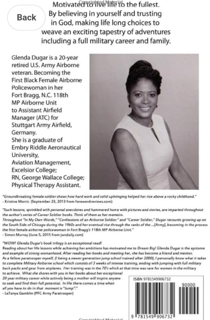 A cancer survivor, mother, and grandmother Glenda Dugar managed to skillfully write all of her books in an inspirational, exciting, and highly refreshing style while taking you to places not many women nor men has ever ventured. She will draw you into her military world while describing her unforgettable experiences that challenged her and continue to challenge women entering and serving in the military worldwide.